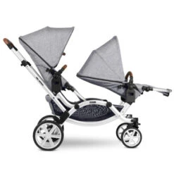 Cette poussette double est idéale pour promener deux enfants d’âge rapproché : un nouveau-né peut être allongé sur le siège arrière surélevé et transformable en nacelle par tablier rabattable, tandis qu’un enfant un peu plus âgé peut être placé dans le siège avant, inclinable sur deux positions.